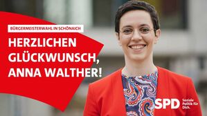 Die SPD in Baden-Württemberg gratuliert Anna Walther ganz herzlich zur Wahl als Bürgermeisterin von Schönaich. Die 36-jährige Sozialdemokratin setzte sich bei der Wahl deutlich mit 59,9 Prozent der Stimmen gegen ihre vier Mitbewerber*innen durch.