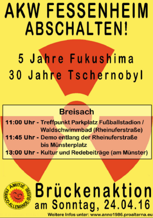 Dieses Jahr jährt sich die Nuklearkatastrophe von Tschernobyl zum dreißigsten Mal und die Kernschmelze von Fukushima zum fünften Mal. Anlässlich dieser traurigen Jahrestage unterstützen wir die gemeinsamen Demonstrationen an den Rheinbrücken zwischen Offenburg und Bodensee. Wir sind stolz, dass wir die Kundgebung in Breisach mitorganisieren dürfen und laden Sie alle sehr herzlich dazu ein.